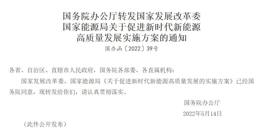 發(fā)表時間:2022-06-01 關注:785經國務院同意,近日,國務院辦公廳轉發(fā)國家發(fā)展改革委、國家能源局《關于促進新時代新能源高質量發(fā)展的實施方案》。(以下簡稱《實施方案》),旨在錨定到2030年我國風電、太陽能發(fā)電總裝機容量達到12億千瓦以上的目標,加快構建清潔低碳、安全高效的能源體系。